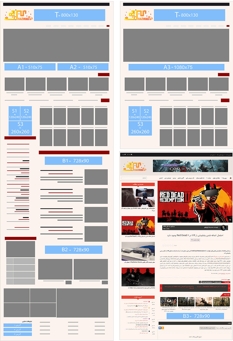 توجه: مستطیلهای آبی رنگ، فضای تبلیغات بنری در وبسایت هستند.