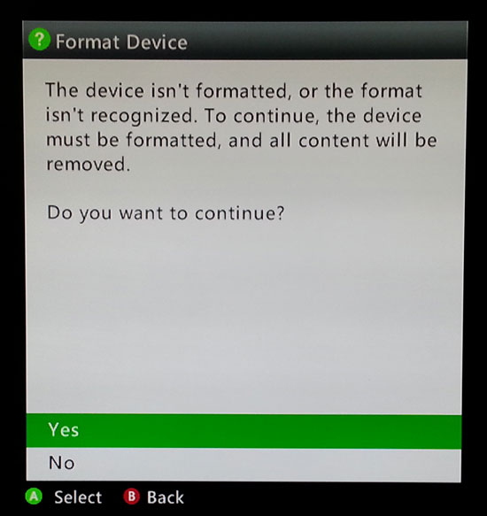 نکته ی دوم : در بالا به این مورد اشاره شد که باید حافظه ی فلش یا هارد اکسترنال شما به صورت Fat32 فرمت شده باشد تا توسط ایکس باکس قابل استفاده باشد و روشی نیز برای فرمت کردن هارد به شما معرفی کردیم . اگر به روش بالا نتوانستید حافظه ی فلشتان را فرمت کنید می توانید از خود ایکس باکس برای این کار استفاده کنید . به این صورت که بعد از کلیک بر روی حافظه ی فلشتان در سر فصل Storage موجود در قسمت تنظیمات دستگاه ، کنسول از شما خواهد پرسید که تمایل دارید فلشتان را فرمت کنید؟ و در صورتی که Yes را انتخاب نمائید این کار توسط کنسول شما انجام خواهد شد . باز هم تاکید میکنم که در این حالت اطلاعات شما از روی حافظه ی فلش یا هارد اکسترنالتان پاک خواهد شد پس در صورت نیاز از روی اطلاعاتتان کپی برداری کنید . در رابطه با این مورد در پائین بیشتر توضیح داده شده است .