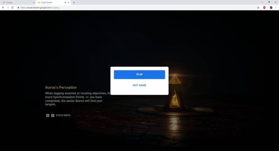 تجربه این بازی غیر از مرورگر کروم و اکانت گوگل، حتما به یک اکانت یوبیسافت نیز نیاز دارد و بازیکن از روشهای مختلفی مثل ماوس و کیبورد یا یک کنترلر USB میتواند بازی را تجربه کند. تجربه خود بازی نیز براساس گزارشی از پالیگان، به شکل سورپرایزکنندهای عالی بوده است. سرعت بارگذاریها بسیار سریع و تجربه بازی از روش استریمی و ابری نیز به همان خوبی تجربه بازی روی سیستمهای خانگی توصیف شده است. حرکات، کنترلها و حتی در زمان مبارزات، همه چیز به شکلی روان و واکنشگرا، درست مثل حالت سنتی عمل میکند. در این زمینه گفته شده که حتی در مبارزات شلوغ و زمان دفاع کردن و جاخالی دادن نیز هیچ گونه لگ و تاخیری که از بازیهای استریمی سراغ داریم دیده نمیشود.