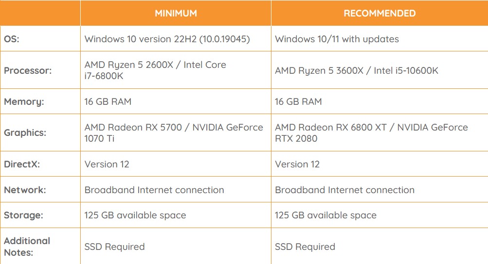 همانطور که در جدول نیز مشاهده میشود، برای تجربه بازی در هر دو حالت حداقل و توصیهشده بایستی از حافظه پرسرعت SSD استفاده شود. در اینجا همچنین به فضای ذخیره 125 گیگابایتی و همچنین حداقل 16 گیگابایت حافظه رم نیز نیاز است.