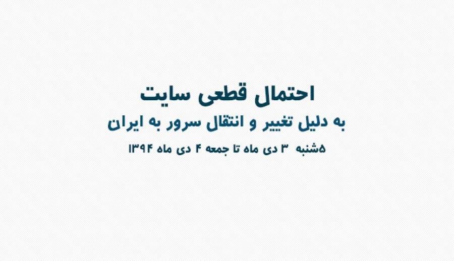 تغییر سرور از روز 5 شنبه سوم دیماه آغاز خواهد شد و امیدوار هستیم که تا انتهای روز جمعه انتقال سرور بطور کامل انجام گیرد . اما در این بازه ی زمانی ممکن است شما با قطعی هائی در زمان دسترسی به سایت مواجه شوید . پیشاپیش سپاسگزار بردباری شما هستیم