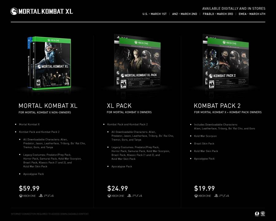 کمپانی WB Games قیمت محتوای اضافی جدید Mortal Kombat X + نسخه XL آنرا مشخص کرد. بنا به اعلام این کمپانی، Mortal Kombat XL که علاوه بر خود بازی، هر دو محتوای اضافی Kombat Packs را نیز با خود به یدک می کشد در 1 مارس مصادف با با قیمتی معادل 60 دلار برای پلتفرم های PS4 و Xbox One به فروش خواهد رسید. محتوای اضافی Kombat Pack 2 نیز با قیمتی معادل 20 دلار به فروش خواهد رسید.خوشبختانه آندسته از افرادی که این عنوان را دارا می باشند برای دستیابی به این دو محتوای اضافی نیازی نیست که هر یک از آنها را به طور جداگانه یا نسخه XL آنرا خریداری کنند زیرا که کمپانی WB Games پک XL که حاوی دو محتوای اضافی Kombat Pack است را نیز با قیمتی معادل 25 دلار به فروش خواهد رساند.