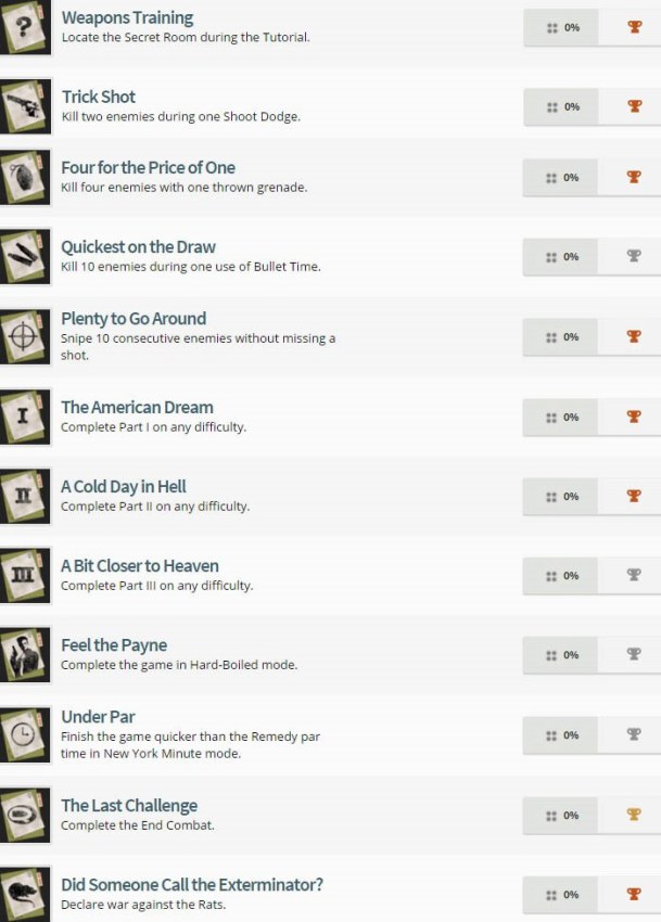 به تازگی سایتی به نام exophase دوازده تروفی برای نسخه PS4 عنوان Max Payne لیست کرده است که در ادامه می توانید آنها را مشاهده نمایید، احتمال می رود که کمپانی فنلاندی Remedy نسخه PS2 آنرا برای PS4 بازسازی نماید.