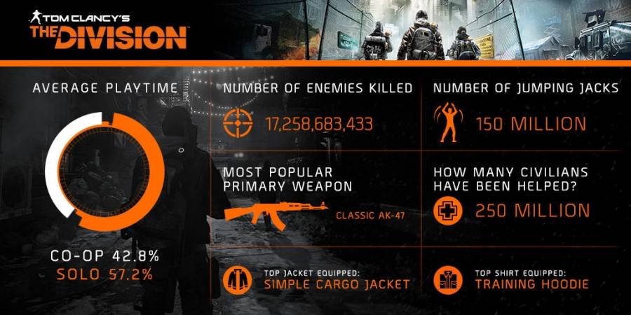 Ubisoft امروز اطلاعاتی در مورد فعالیتهایی که بازیکنان طی چند هفته اخیر در بازی The Division مشغول آن بوده اند منتشر کرد.بازیکنان 17,258,673,433 دشمن را از زمان عرضه بازی کشته اند ، محبوبترین سلاح اصلی هم Classic AK-47 شناخته شد.. بیش از نیمی از بازیکنان زمان خود را به صورت انفرادی سپری کرده اند و در حدود 42.8% از میانگین زمان بازی در قسمت های گروهی سپری شده است. در آمار جالبی دیگر از این بازی بازیکنان از زمان عرضه 150 میلیون بار حرکت پروانه رفته اند. البته این اطلاعات شامل تعداد دفعات مرگ بازیکنان نمی باشد و احتمالا این رقم تا قبل از عرضه آپدیت بزرگی که فردا قرار است منتشر شود ، مشخص خواهد شد.