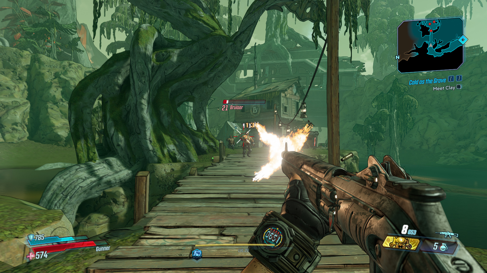 مبارزات تا حد نسبتا زیادی داینامیک بوده و این داینامیک بودن را مدیون قابلیتهای چهار کارکتر اصلی، تنوع بسیار بالای اسلحهها، هوش مصنوعی خوب دشمنان و یا حتی دیزاین زیبای محیطهای بازی هستند. چهار کارکتر برای انتخاب وجود دارد که هر کدام از آنها سه قابلیت مختلف داشته و این قابلیتها را میتوان توسط یک Skill Tree ارتقا داد؛ البته بجز Moze که سه قابلیت او در واقع سه اسلحه مختلف برای Iron Bear هستند(آیرون بر روبات قابل کنترل Moze است که شباهت زیادی به تایتانهای سری تایتان فال دارد). همین چهار کارکتر خود به تنهایی میتوانند شما را قانع کنند که برای بار دوم هم بازی را به اتمام برسانید، چرا که قابلیتهای هر کدام راه را برای انجام دادن مبارزات به روشهای جدید باز میکنند. علاوه بر قابلیتهای کارکترها، گان پلی معرکه و تعداد و تنوع دیوانه کننده اسلحهها و دیگر لوتها نیز شما را در همه حال تشنه مبارزات بیشتر نگه میدارند. همیشه دلیلی برای گشتن محیط اطرافتان وجود دارد و علاوه بر لوتی که از دشمنان میافتد و یا در جعبهها و صندوقچهها پیدا میشود، در هر سوراخ سمبهای یک شیلد، نارنجک، Mod، مقداری پول و یا اسلحه جدیدی در انتظار شما نشسته است. و مطمئن باشید به خاطر سیستم لول بندی خوب و گان پلی معرکه بازی، حاضر نخواهید بود به راحتی از کنار هر لوتی عبور کنید. به لطف فیزیک و صدا گذاری عالی، شلیک کردن تک تک اسلحهها حس فوق العادهای دارد. Recoil یا لگد هر اسلحه به خوبی حس میشود و صداهایی که هر کدام از خود در میآورند واقعا گوش نواز هستند، از صدای خرچ خرچ خشاب گذاری یک ریولور گرفته تا صدای مهیب شلیک یک شاتگان. لازم به ذکر است که افکتهای تصویری رنگارنگ و موسیقیهای هیجان انگیز بازی نیز جذابیت گان پلی و مبارزات را چندین برابر میکنند.