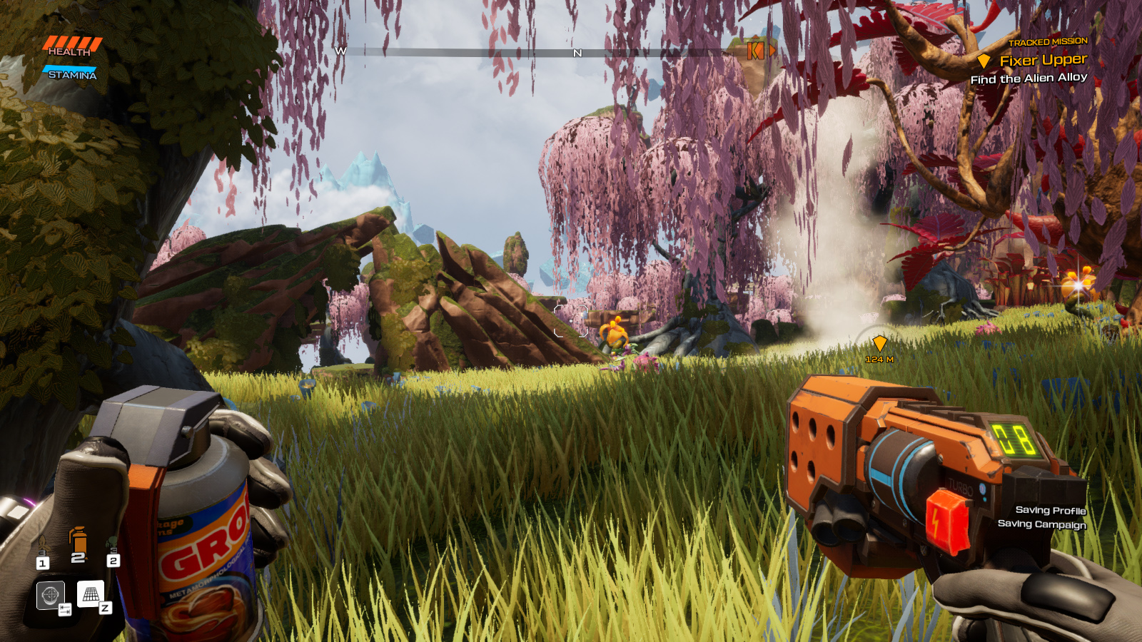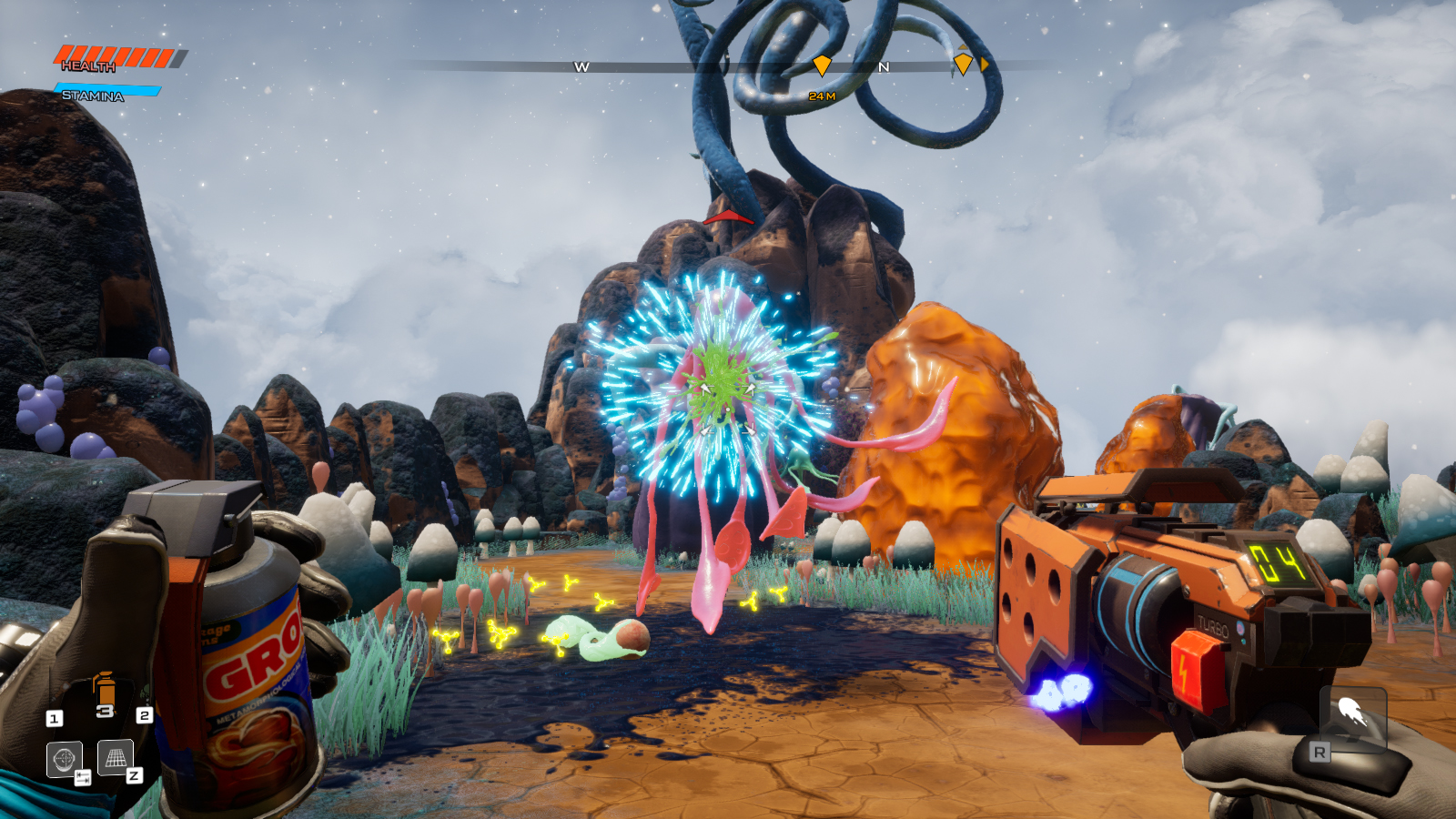 همانند بسیاری از عناوین جهان باز، در JTTSP نیز یک سری ابزار و اسلحه برای شما در نظر گرفته شده که ماجراجویی شما را کمی سهولت میبخشند. یکی از مهمترین این ابزارها اسکنر شماست؛ اسکن کردن اشیاء و موجودات جدیدی که در دنیای بازی پیدا میکنید بجز یک جمله طنز از همراه AI شما که شما را با محیط اطرافتان آشنا میکند، پاداش خاصی را به دنبال ندارد؛ با این وجود من در طول بازی همیشه به دنبال چیز جدیدی بودم تا آن را اسکن کنم، چرا که آشنا شدن با دنیای بازی در JTTSP خود به تنهایی یک سرگرمی عالی به حساب میآید. همانطور که گفته شد، "سیاره وحشی" با وجود اندازه کوچکی که دارد مملو از رمز و راز و جزئیات است. به طور کلی سیاره از چندین قسمت مختلف تشکیل شده که هر کدام تفاوتهای قابل توجهی با یکدیگر دارند؛ ممکن است یک قسمت از سیاره یک منطقه برفی باشد که موجوداتی مانند جوجه مرغ در آن زندگی میکنند و قسمتی دیگر یک جنگل باشد که ساکنانش ماهیهای پرنده هستند. و همین عجیب و غریب بودن و تنوع جالب دنیای بازی است که همواره به شما انگیزه بیشتری برای گشت و گذار و اکتشاف میدهد.