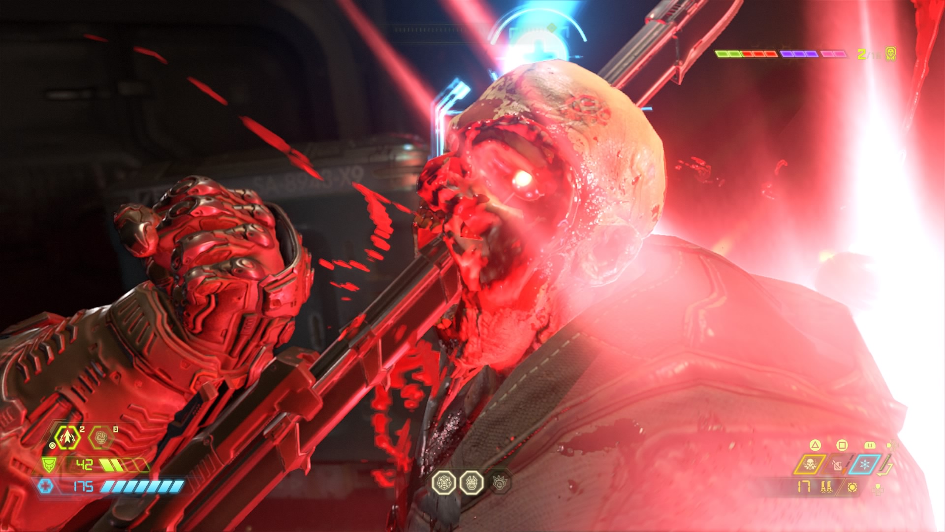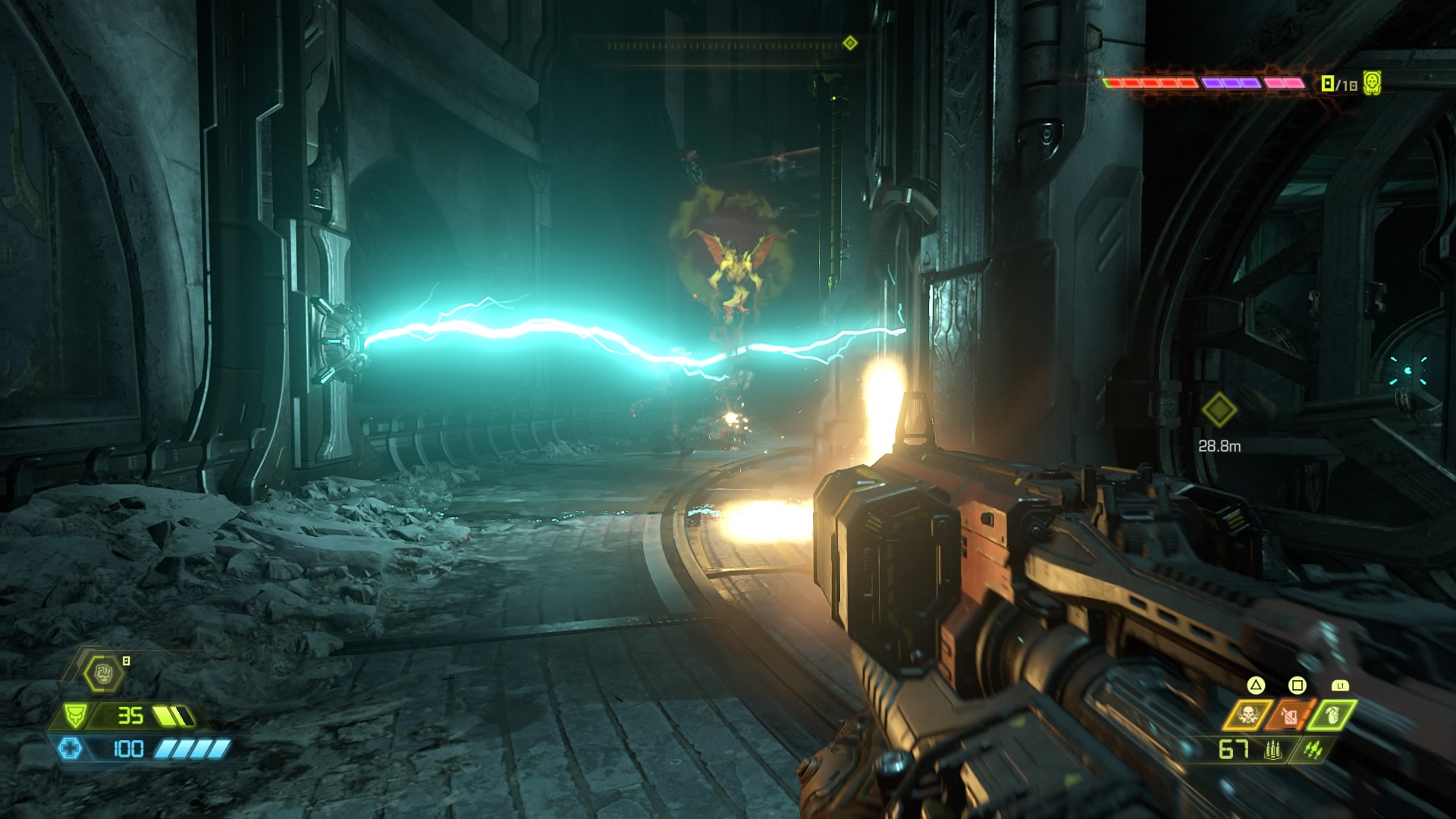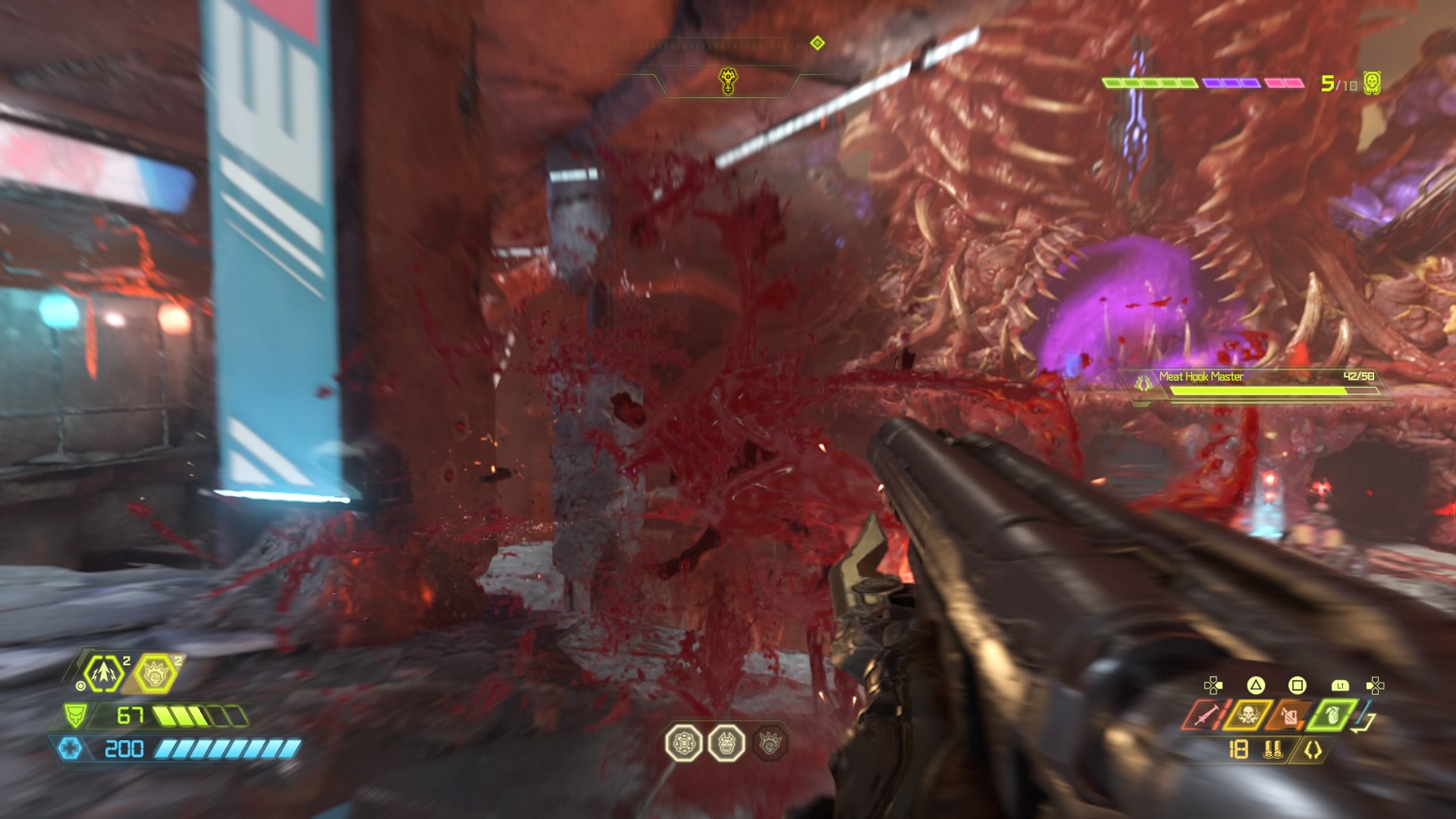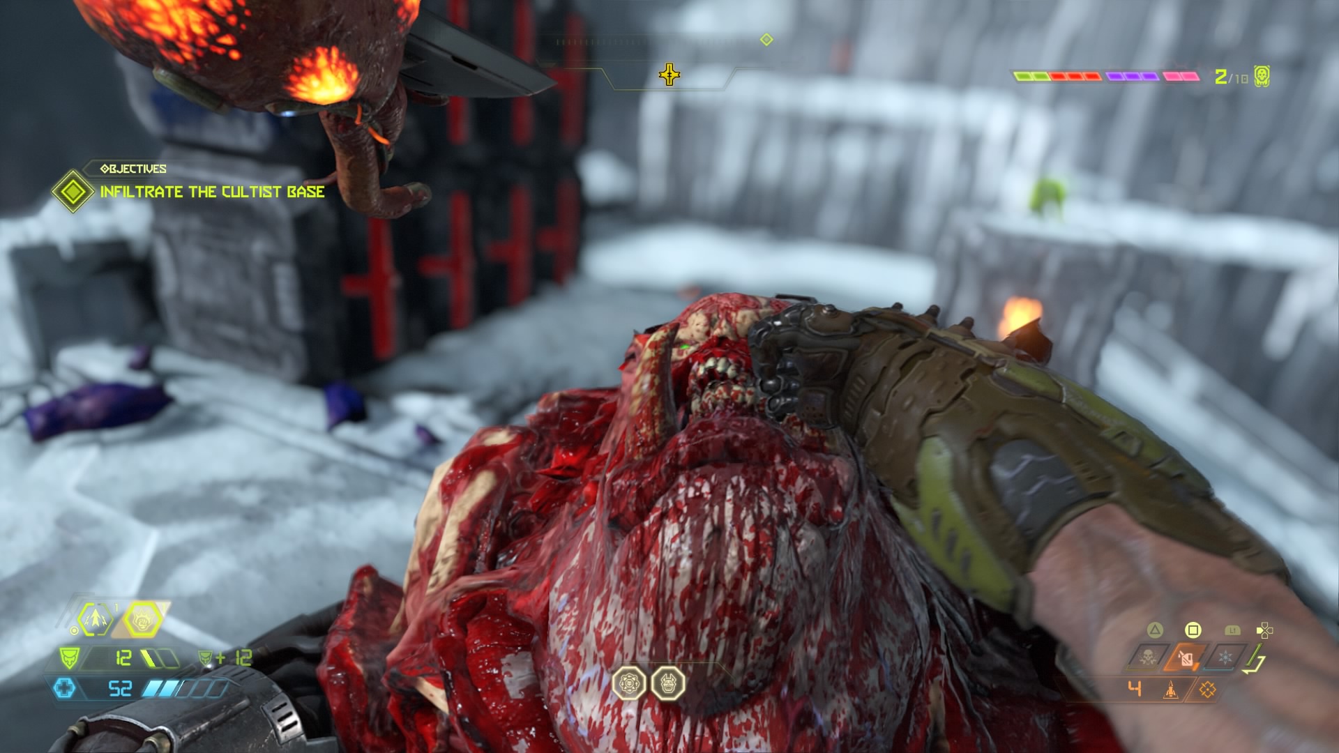 علاوه بر حرکات سریع شما، فاکتور دیگری که تاثیر به سزایی در پیروز شدن در مبارزات دارد، زرنگی شما و تصمیماتی است که در هر ثانیه اتخاذ میکنید؛ به دلیل دیزاین متنوع و عالی دشمنان، هر کدام از آنها خصوصیات متفاوتی داشته و شما را به شکل خاصی مورد حمله قرار میدهند، شما نیز اگر میخواهید پیروز میدان باشید باید برای از بین بردن هر کدام از آنها روش متفاوتی را به کار بگیرید و اسلحهها و قابلیتها فراوانی که در اختیارتان است، این روشهای متفاوت را برای شما فراهم میکنند؛ Modهای اسلحهها، Runeهای مختلف، آپگریدهای لباس اسلیر و یا حتی قابلیت جدید او یعنی Dash، همه و همه راه را برای انجام دادن مبارزات به صدها روش مختلف باز میکنند. همه این اسلحهها و قابلیتها را در کنار طرح بندی زیبا و مناسب هر مرحله قرار دهید تا متوجه شوید که چرا دوم اترنال ارزش تکرار بسیار بالایی دارد. البته وجود این آزادی عمل به تنهایی برای پیروز شدن در مبارزات کافی نیست، نکته مهمتر این است که باید تصمیم درست را در زمان درست اتخاذ کنید چرا که کوچکترین اشتباه میتواند کشنده باشد و همین ویژگی مبارزات را به شدت هیجان انگیز و نفس گیر میکند. برای مثال، زمانی که فقط پنج درصد از جان اسلیر باقی مانده استفاده از Glory Kill(چیزی مانند Take Down با این تفاوت که خشونت بیشتری دارد) میتواند شما را از مرگ حتمی نجات دهد(چراکه گلوری کیل باعث میشود دشمنان Health Bar از خود به جا بگذارند) و زمانی که با کمبود مهمات مواجه میشوید، استفاده از اره برقی اسلیر(که باعث میشود دشمنان از خود مهمات به جا بگذارند) برای چند دقیقه خیال شما را آسوده نگه میدارد. استفاده درست از اسلحهها نیز اهمیت بسیار زیادی دارد؛ در وخیمترین شرایط، زمانی که هیچ امیدی به پیروز شدن ندارید، شاید استفاده از یک اسلحه مناسب به تنهایی بتواند شما را از مخمصه نجات دهد. برای مثال، شاتگان بهترین راه برای از سر راه برداشتن دشمنان کند است، مسلسلهای شما در دور نگه داشتن Cacodemonها(شیاطین روی اعصابی که به سمت شما پرواز میکنند) بسیار موثر است و یا راکت لانچر میتواند سرعت دشمنان قوی هیکل را کاهش داده و به شما فرصتی برای فرار بدهد. در ابتدای بازی شاید کارایی اسلحهها و قابلیتها کمی گیج کننده به نظر برسد و فراگرفتنشان اعصاب شما را بهم بریزد، مخصوصا به خاطر HUD شلوغ بازی؛ اما زمانی که با کنترل آن آشنایی لازم را پیدا کرده و در مبارزات ماهر شوید، تمامی درگیریهای شما با دشمنان به رقصهای زیبا و پر هرج و مرجی تبدیل شده که باعث میشوند از شدت هیجان بالا و پایین بپرید.