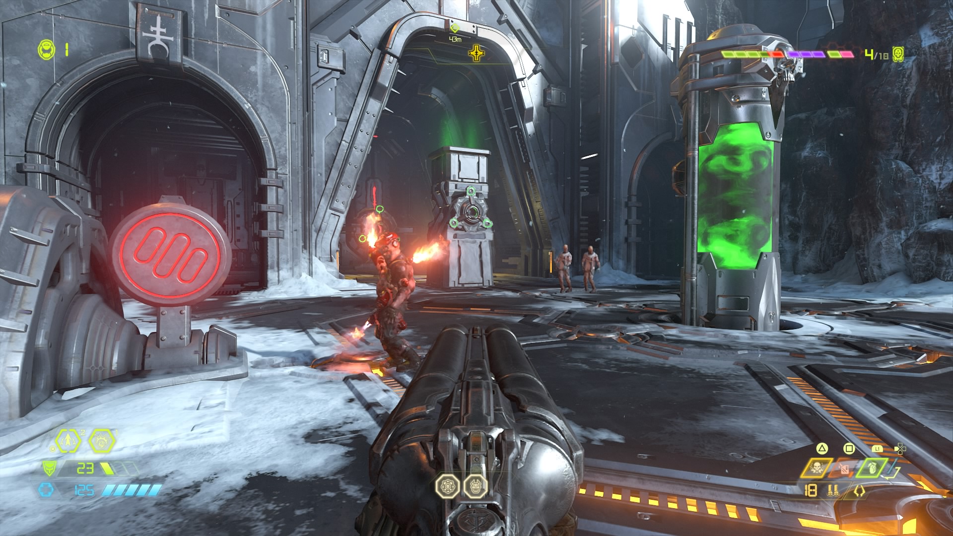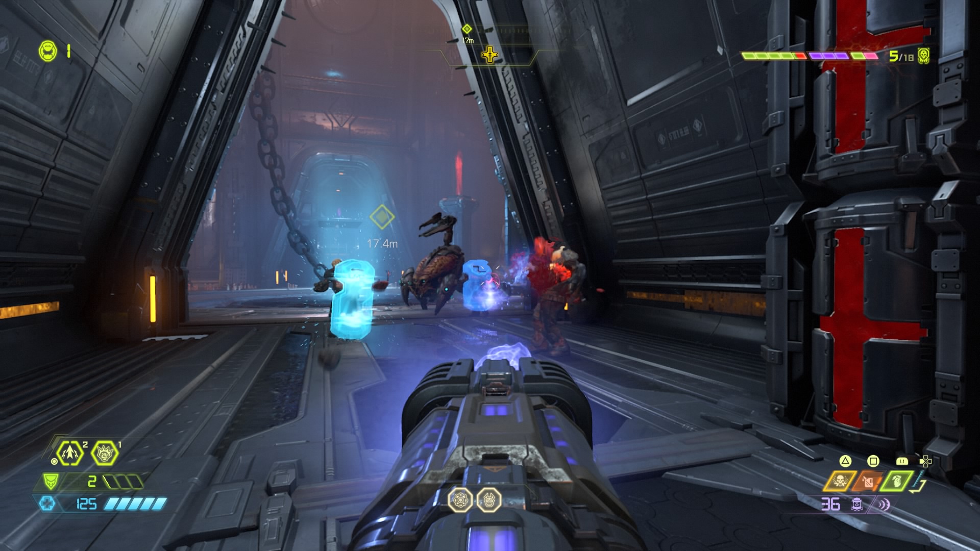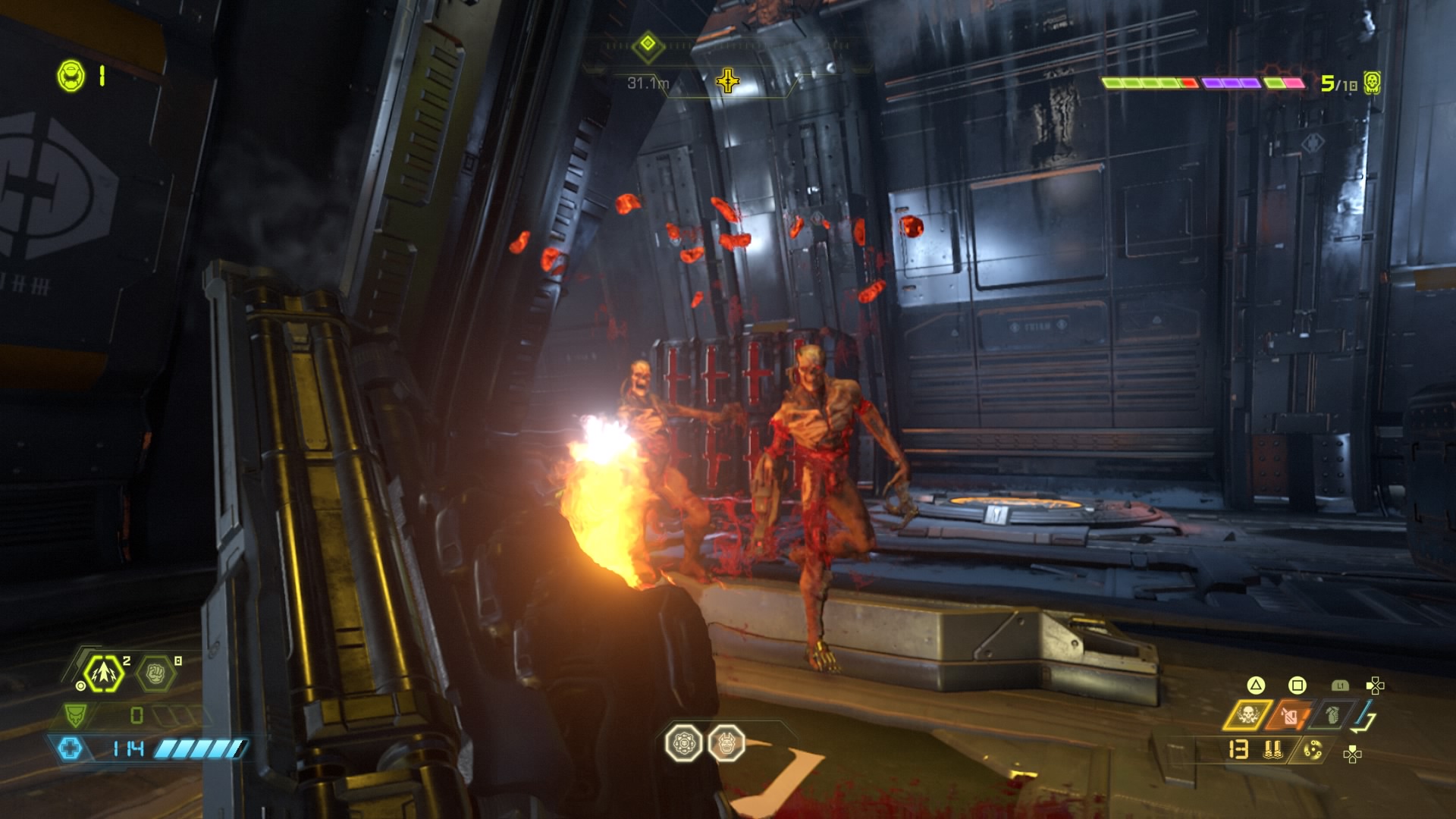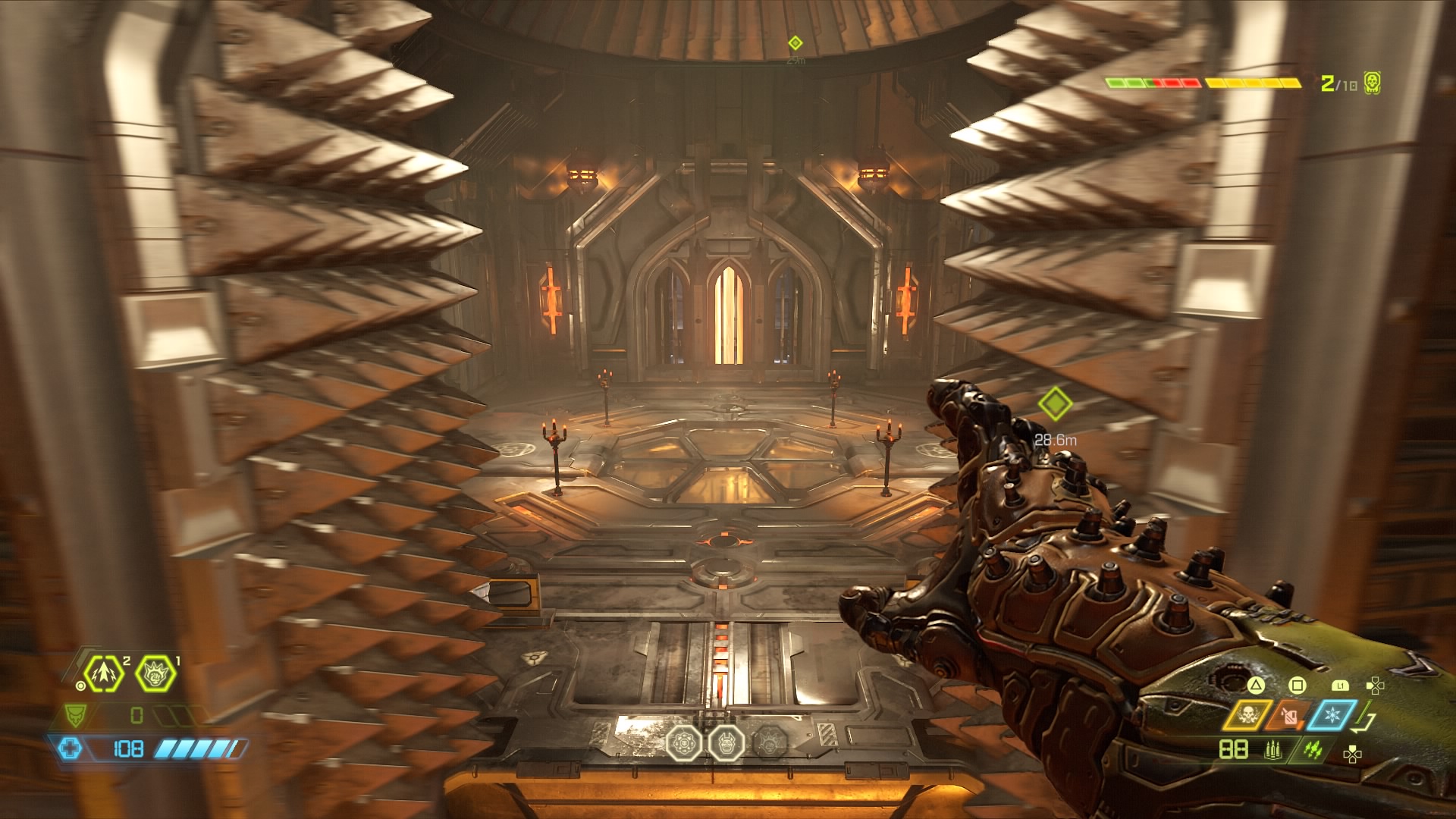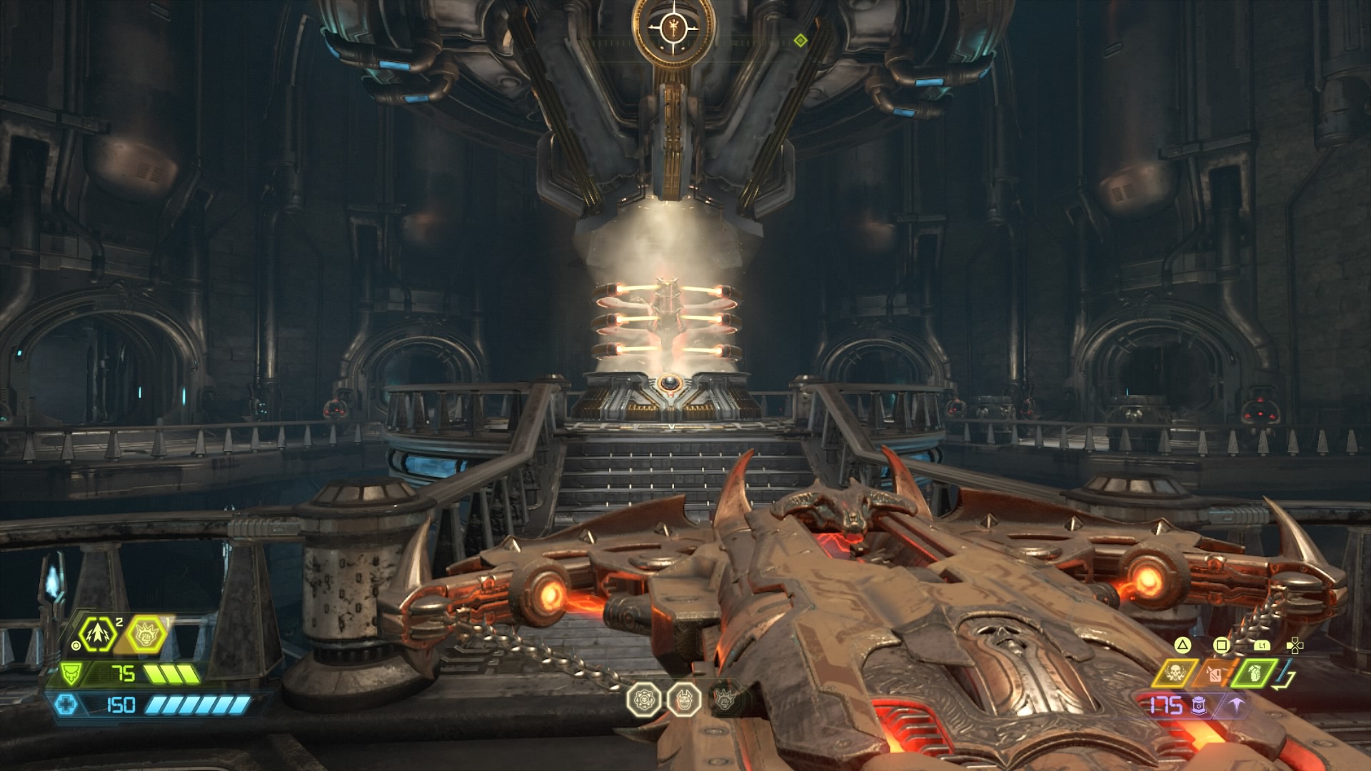 علاوه بر حرکات سریع شما، فاکتور دیگری که تاثیر به سزایی در پیروز شدن در مبارزات دارد، زرنگی شما و تصمیماتی است که در هر ثانیه اتخاذ میکنید؛ به دلیل دیزاین متنوع و عالی دشمنان، هر کدام از آنها خصوصیات متفاوتی داشته و شما را به شکل خاصی مورد حمله قرار میدهند، شما نیز اگر میخواهید پیروز میدان باشید باید برای از بین بردن هر کدام از آنها روش متفاوتی را به کار بگیرید و اسلحهها و قابلیتها فراوانی که در اختیارتان است، این روشهای متفاوت را برای شما فراهم میکنند؛ Modهای اسلحهها، Runeهای مختلف، آپگریدهای لباس اسلیر و یا حتی قابلیت جدید او یعنی Dash، همه و همه راه را برای انجام دادن مبارزات به صدها روش مختلف باز میکنند. همه این اسلحهها و قابلیتها را در کنار طرح بندی زیبا و مناسب هر مرحله قرار دهید تا متوجه شوید که چرا دوم اترنال ارزش تکرار بسیار بالایی دارد. البته وجود این آزادی عمل به تنهایی برای پیروز شدن در مبارزات کافی نیست، نکته مهمتر این است که باید تصمیم درست را در زمان درست اتخاذ کنید چرا که کوچکترین اشتباه میتواند کشنده باشد و همین ویژگی مبارزات را به شدت هیجان انگیز و نفس گیر میکند. برای مثال، زمانی که فقط پنج درصد از جان اسلیر باقی مانده استفاده از Glory Kill(چیزی مانند Take Down با این تفاوت که خشونت بیشتری دارد) میتواند شما را از مرگ حتمی نجات دهد(چراکه گلوری کیل باعث میشود دشمنان Health Bar از خود به جا بگذارند) و زمانی که با کمبود مهمات مواجه میشوید، استفاده از اره برقی اسلیر(که باعث میشود دشمنان از خود مهمات به جا بگذارند) برای چند دقیقه خیال شما را آسوده نگه میدارد. استفاده درست از اسلحهها نیز اهمیت بسیار زیادی دارد؛ در وخیمترین شرایط، زمانی که هیچ امیدی به پیروز شدن ندارید، شاید استفاده از یک اسلحه مناسب به تنهایی بتواند شما را از مخمصه نجات دهد. برای مثال، شاتگان بهترین راه برای از سر راه برداشتن دشمنان کند است، مسلسلهای شما در دور نگه داشتن Cacodemonها(شیاطین روی اعصابی که به سمت شما پرواز میکنند) بسیار موثر است و یا راکت لانچر میتواند سرعت دشمنان قوی هیکل را کاهش داده و به شما فرصتی برای فرار بدهد. در ابتدای بازی شاید کارایی اسلحهها و قابلیتها کمی گیج کننده به نظر برسد و فراگرفتنشان اعصاب شما را بهم بریزد، مخصوصا به خاطر HUD شلوغ بازی؛ اما زمانی که با کنترل آن آشنایی لازم را پیدا کرده و در مبارزات ماهر شوید، تمامی درگیریهای شما با دشمنان به رقصهای زیبا و پر هرج و مرجی تبدیل شده که باعث میشوند از شدت هیجان بالا و پایین بپرید.