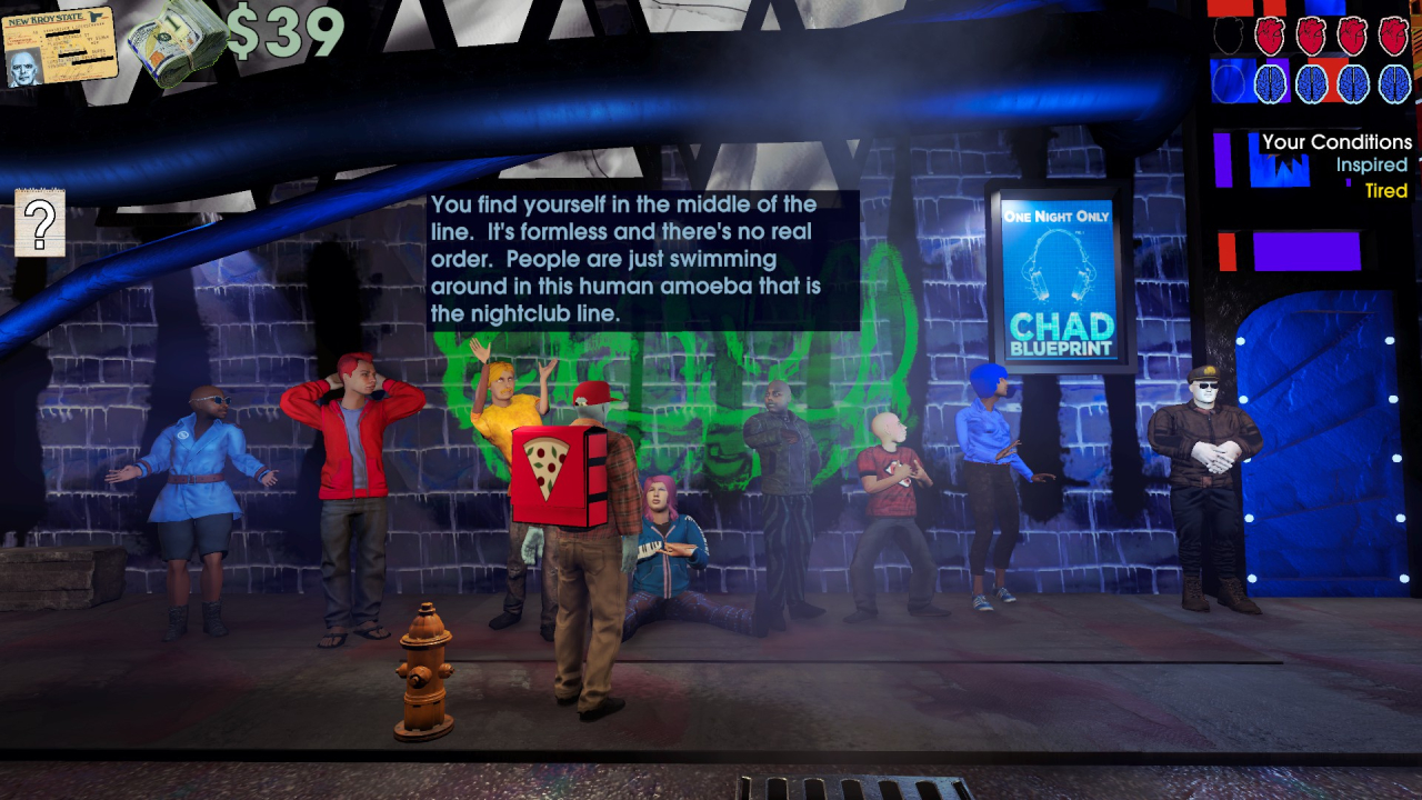 داستان بازی با انتخاب نامی برای شخصیت اصلی و شرح موقعیت پیش رو توسط بالادستیتان آغاز میشود. شما در نقش یک مامور مخفی که به شکل یک پیتزا رسان درآمده باید به کلاب شبانهای که قبلا کارخانه تابوت سازی بوده، بروید و همکارتان را که در آنجا گیر کرده و در خطر است، نجات دهید. کمی هیتمن را در نظر بگیرید، منهای لت و پار کردن بقیه، چندین راه مختلف و عجیب برای رسیدن به هدفتان وجود دارد که از طریق سرک کشیدن به اطراف و حرف زدن با شخصیتهای جالب کلاب، سرنخهایی کم کم پیدا میکنید که شما را به نجات فرد مورد نظر نزدیک میکند.