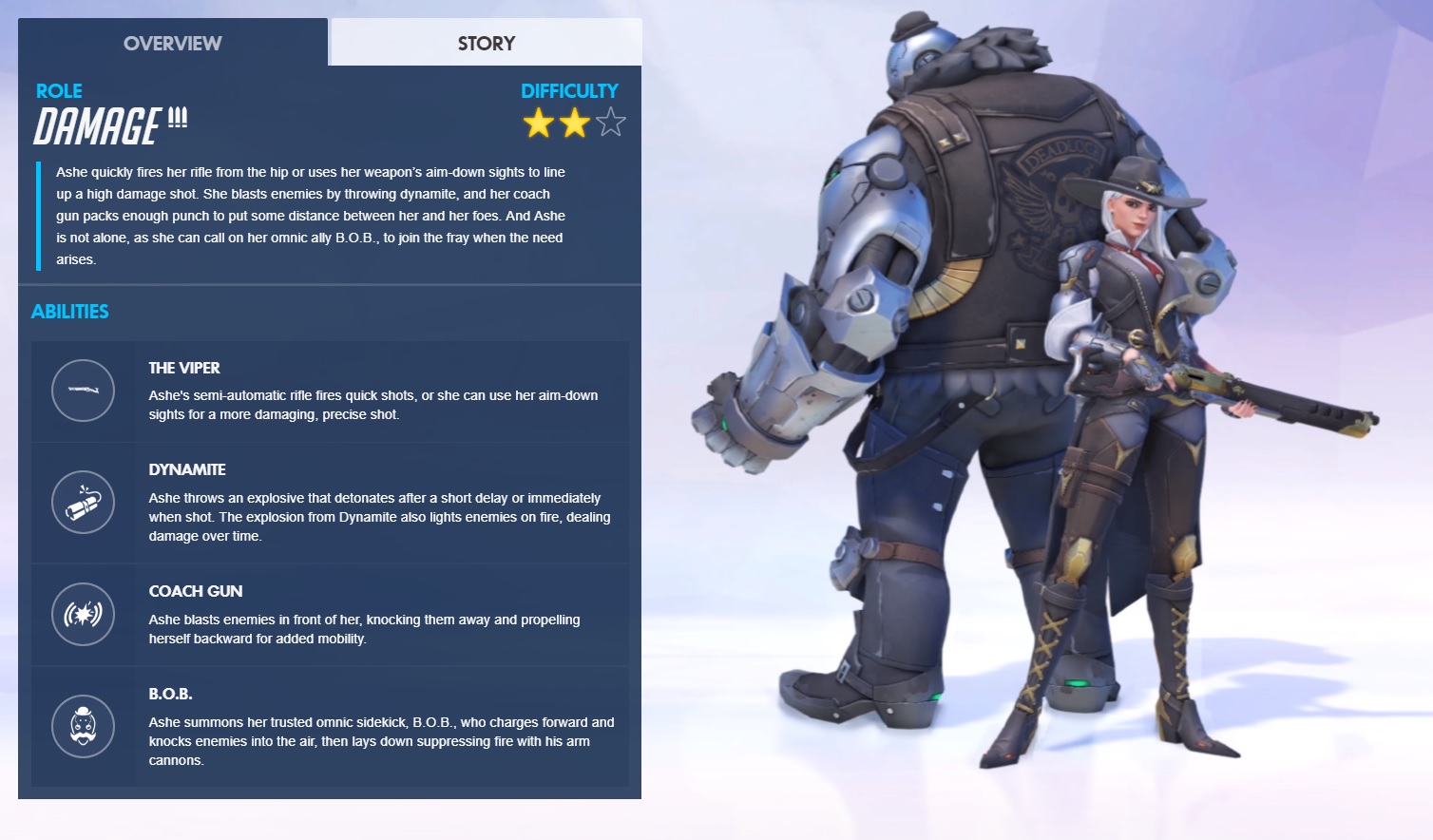 در جدیدترین اخبار بازی در بازیمگ؛ شرکت بلیزارد اینترتیمنت (Blizzard Entertainment) به دنبال انتشار انیمیشن کوتاه جدیدی از بازی اورواچ در جریان کنفرانس مطبوعاتی خود، پیش از شروع بلیزکان ۲۰۱۸ میلادی (BlizzCon 2018)، از قهرمان جدید بازی Overwatch به نام Ashe رونمایی کرد. طبق اطلاعات بدست آمده از انیمیشن کوتاه جدید بازی، شخصیت Ashe رهبر گروه خلافکار Deadlock و دوست سابق شخصیت مکری محسوب میشود. او از یک اسلحه تک تیرانداز در کنار Sawed-off شاتگان و همچنین دینامیت که بنظر میرسد در وسط آسمان برای انفجار زودتر میتواند به آن شلیک کند، استفاده میکند. در این میان قابلیت جالب وی که بنظر میرسد از Quake و Unreal Tournament گرفته شده، شامل شلیک شاتگان به زمین میشود که وی را برای چند ثانیه به هوا میفرستد. گفتنی است که Ultimate شخصیت Ashe شامل صدا کردن شخصیت دیگری به نام باب میشود، یک عضو هالک مانند و قوی هیکل از گروه خلافکار Deadlock که برای او آتش پشتیبانی را مهیا میسازد.